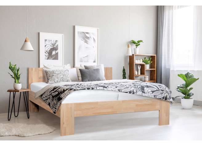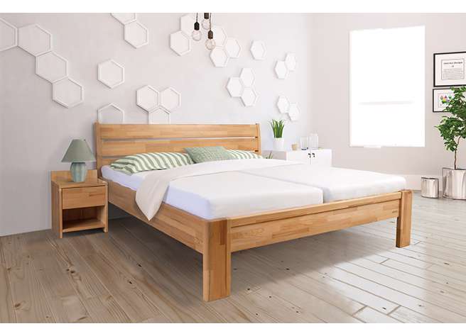 Postel vyrobena z bukového masivu. Nohy z 30mm masivu a vodorovné výplně 30mm. Všechny vnější hrany postele zaoblené. Možnost polohování výšky uložení roštu. Povrchově upraveno bezbarvým UV lakem s vysokou odolností a barevnou stálostí s možností moření. T ...